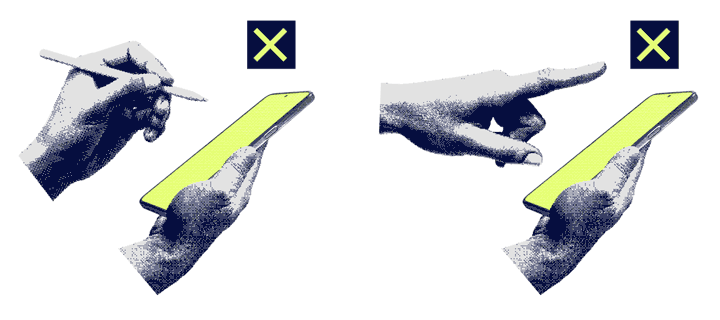 يُفضل تجنّب استخدام الأشياء الصلبة أو الحادة مثل الأقلام أو المفاتيح أو حتى أظافرك على الشاشة. يستخدم جهاز Galaxy Z Flip زجاجًا فائق النحافة، يمكن أن يتعرض للتلف عند الضغط الشديد عليه. بدلاً من ذلك، انقر برفق على الشاشة بإصبعك لحماية سطحها والحفاظ على أدائها.