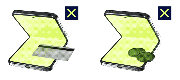 لا. قبل طي الهاتف، تأكد من خلو الشاشة تمامًا من أي أشياء — مثل العملات أو البطاقات أو أي عناصر أخرى. حتى الأشياء الصغيرة يمكن أن تسبب تلفًا خطيرًا عند إغلاق الهاتف. احرص دائمًا على طي الجهاز قبل وضعه في الحقيبة أو الجيب.